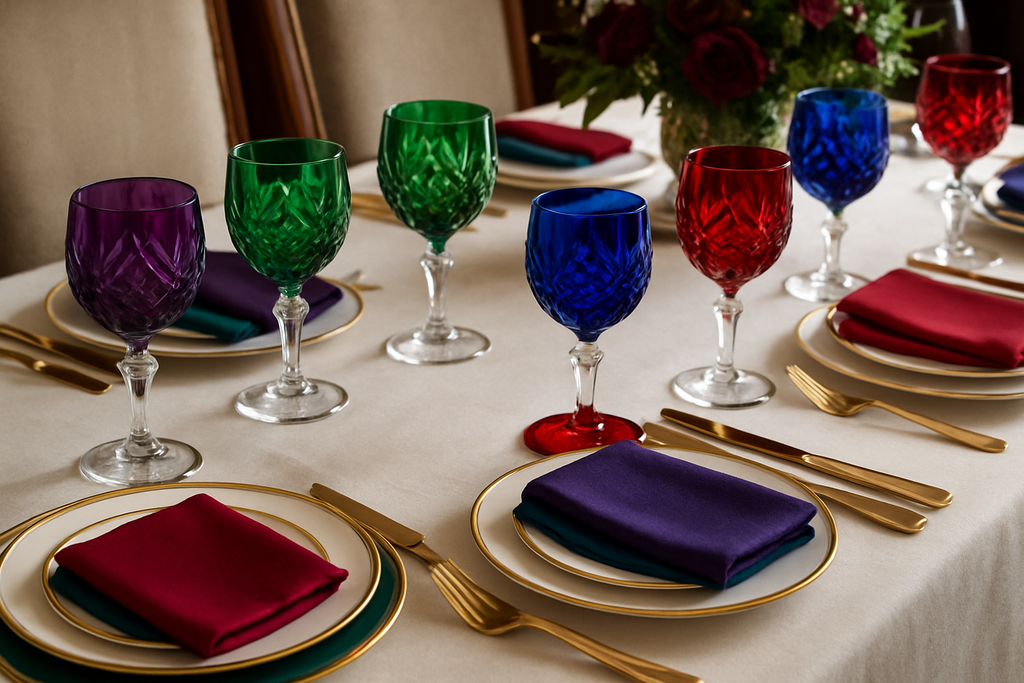 Conjunto exclusivo de 6 copos em cristal colorido com tons de pedras preciosas - esmeralda, safira, rubi, âmbar, ametista e topázio. Cada copo é uma joia funcional que transforma qualquer bebida em experiência luxuosa.