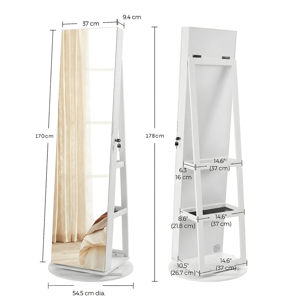 O Espelho Porta-Joias Giratório redefine a organização do seu quarto. Com um design sofisticado sem moldura (frameless) e acabamento branco impecável, ele gira 360° para oferecer acesso instantâneo aos seus acessórios de um lado e um espelho deslumbrante do outro. O interior forrado em veludo preto protege suas joias, enquanto os LEDs automáticos garantem que você brilhe em qualquer hora do dia.