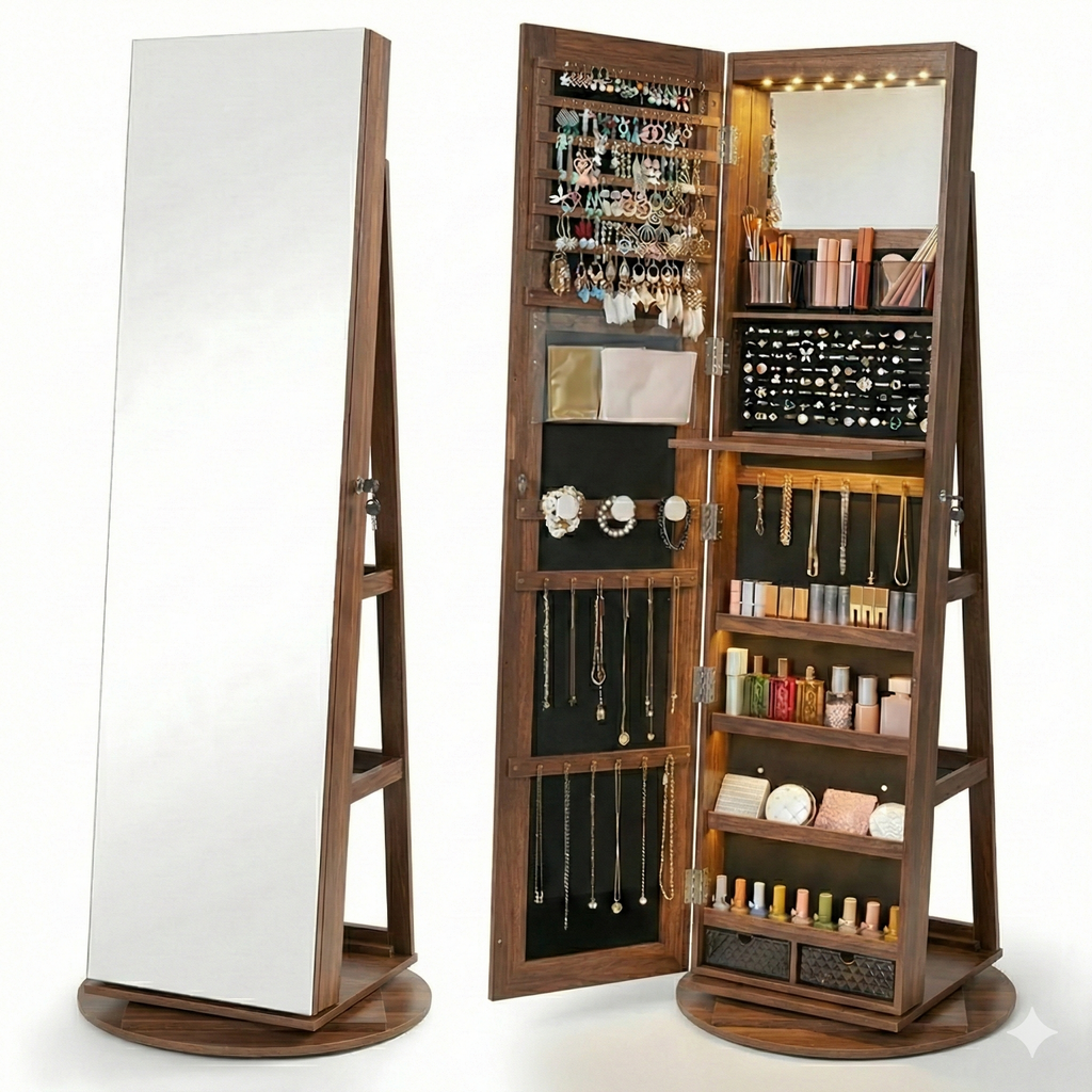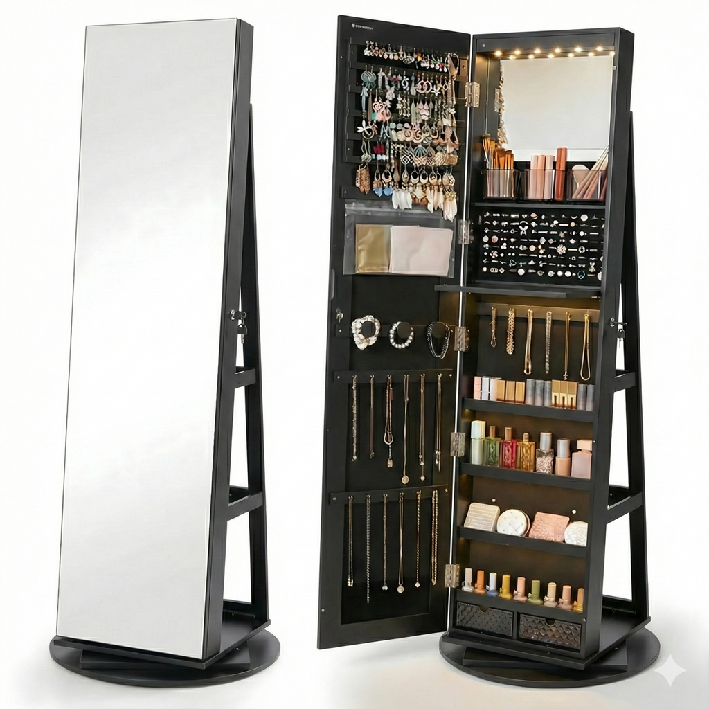 Espelho de corpo inteiro, organizador de joias e estação de maquiagem. Tudo o que você precisa em um giro.