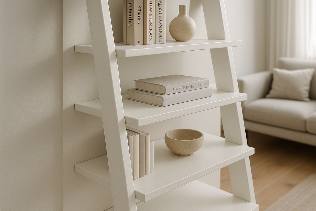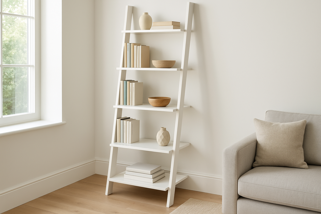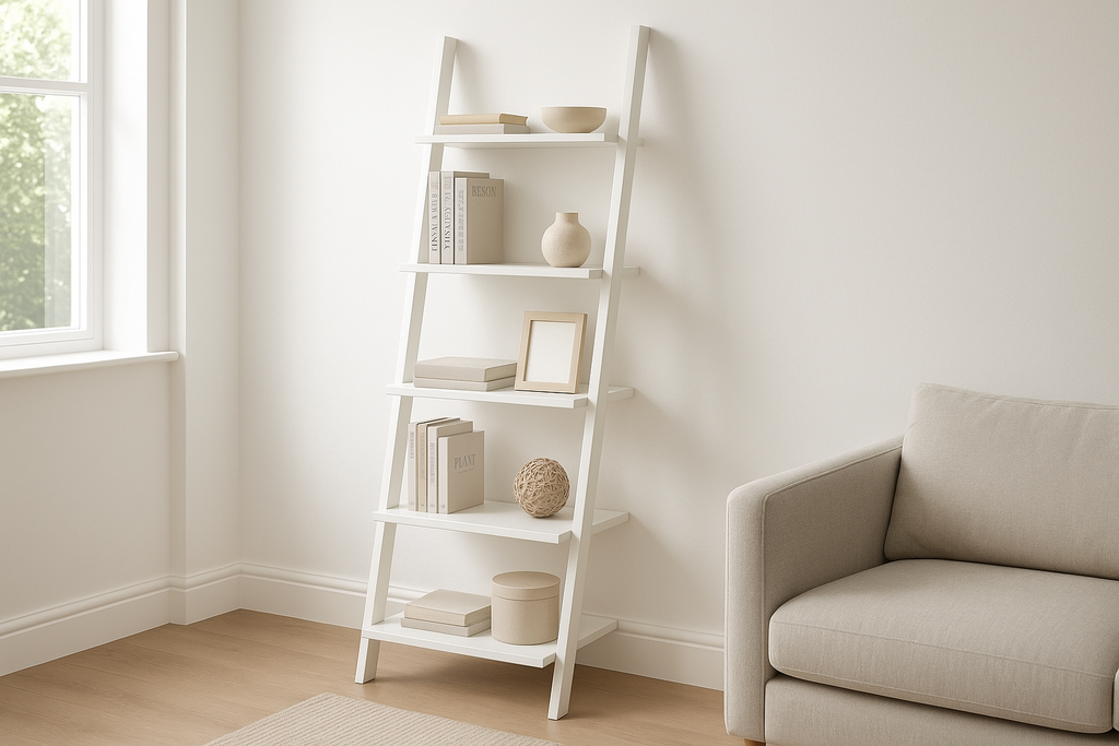 Estante escada em madeira branca com 5 prateleiras que se apoia na parede. Design moderno que otimiza espaço vertical e cria um visual clean e organizado.
