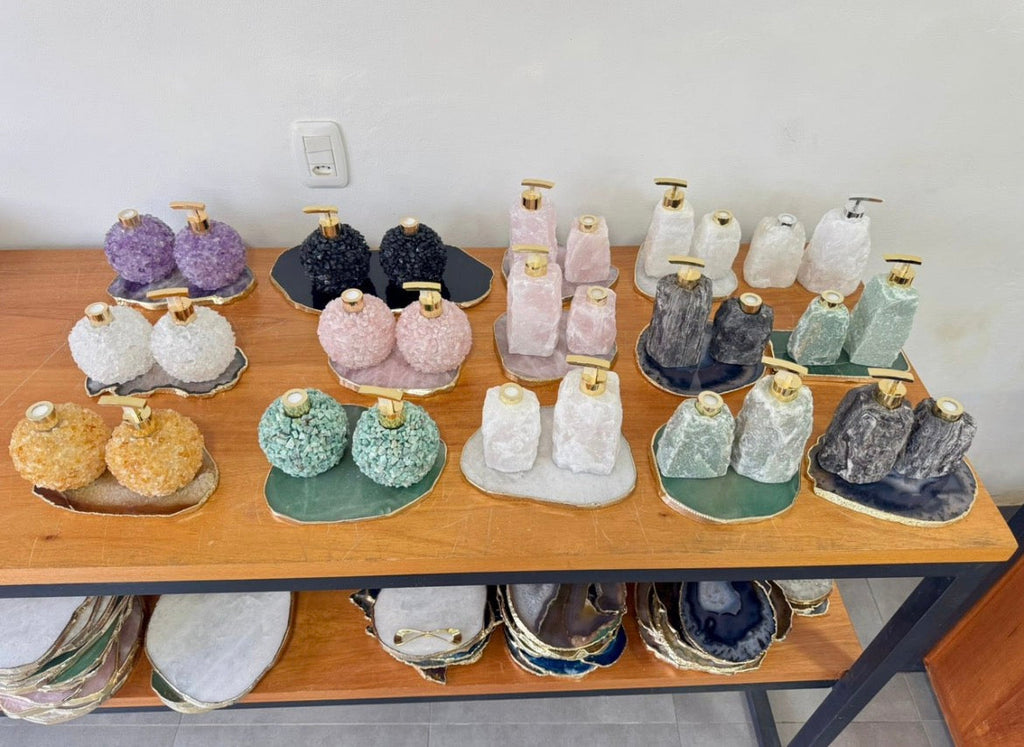 - Dispensers: 2 ou 3 peças em pedras naturais (quartzo, ametista ou ágata) com cristais autênticos