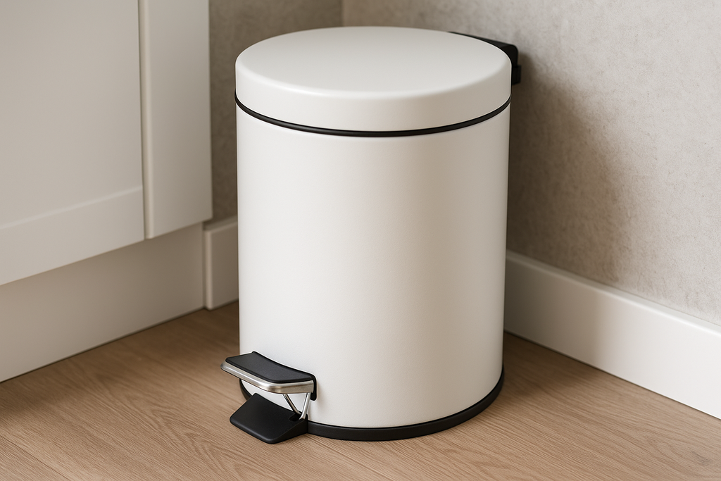Lixeira com pedal em metal branco que abre automaticamente sem usar as mãos. Ideal para manter a higiene na cozinha e facilitar o descarte do lixo durante o preparo dos alimentos.