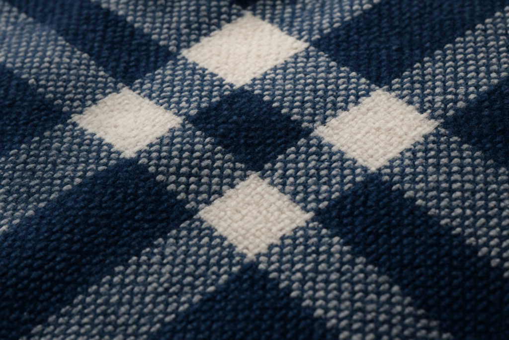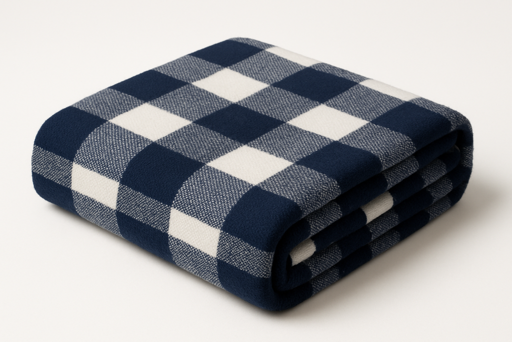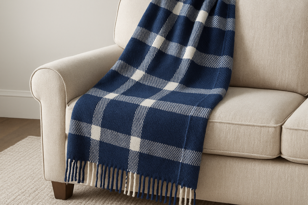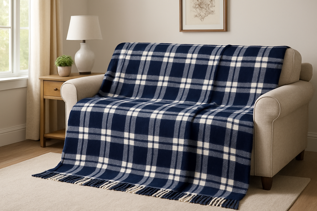 Manta xadrez em azul marinho e branco, um clássico que nunca sai de moda. Perfeita para criar um ambiente aconchegante e elegante no seu sofá.